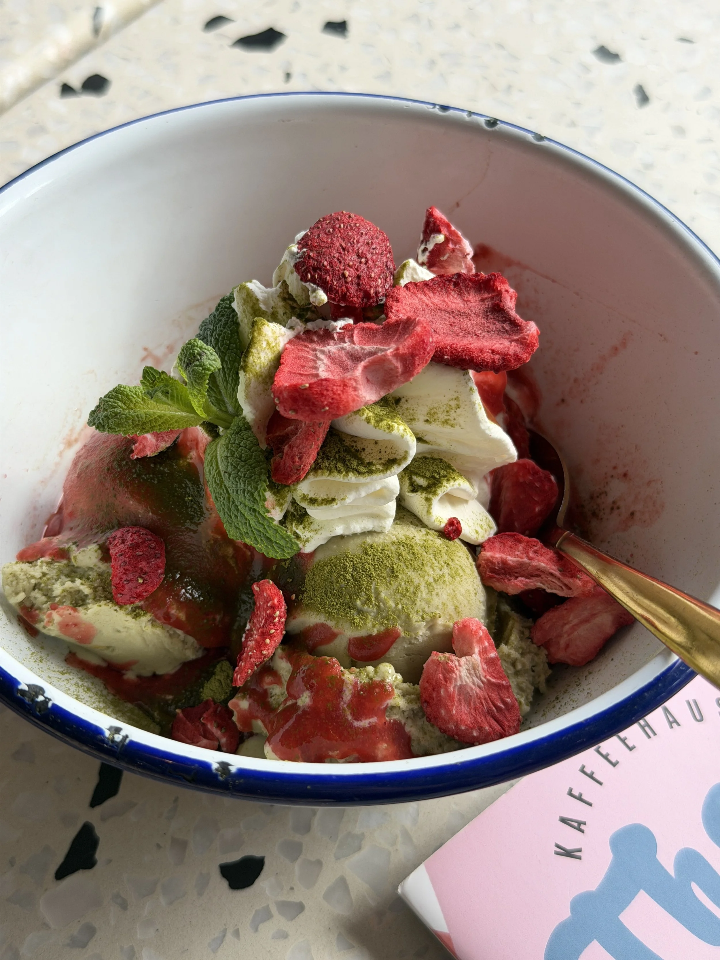 Wenn du in Vechta oder Umgebung unterwegs bist, komm vorbei und probiere unser neues hausgemachtes Matcha-Eis oder direkt unseren Iced Strawberry Matcha Eisbecher.